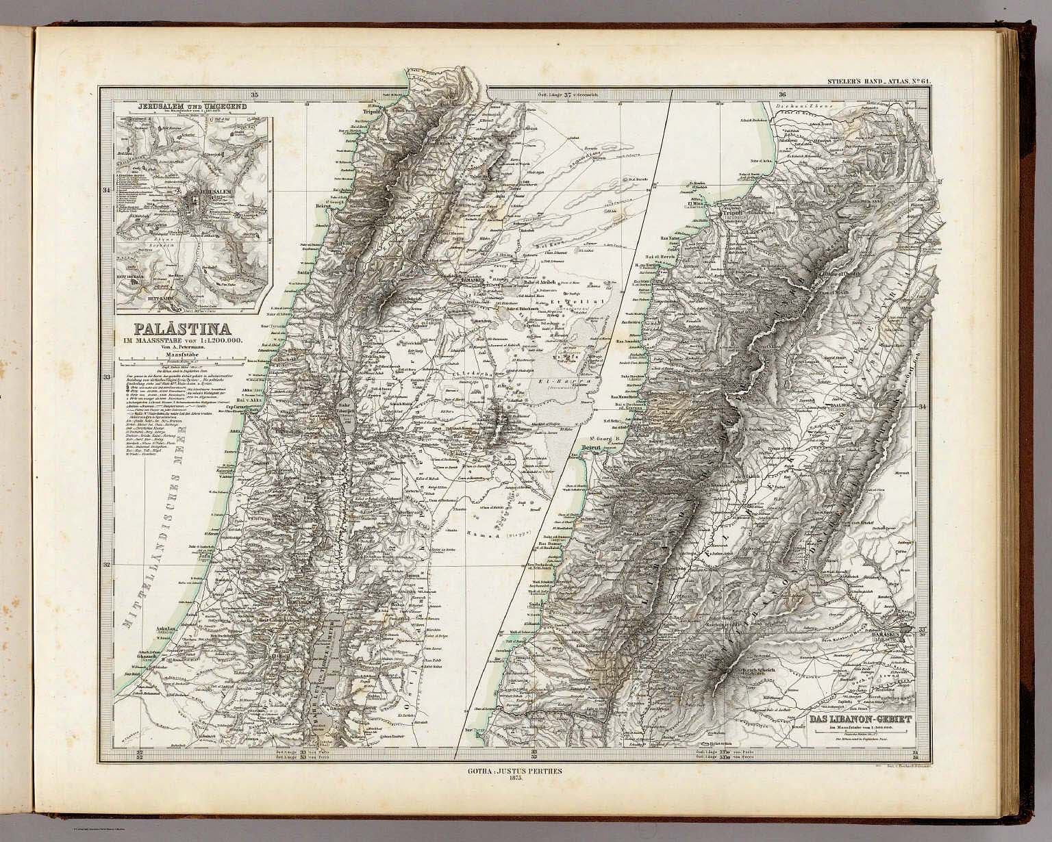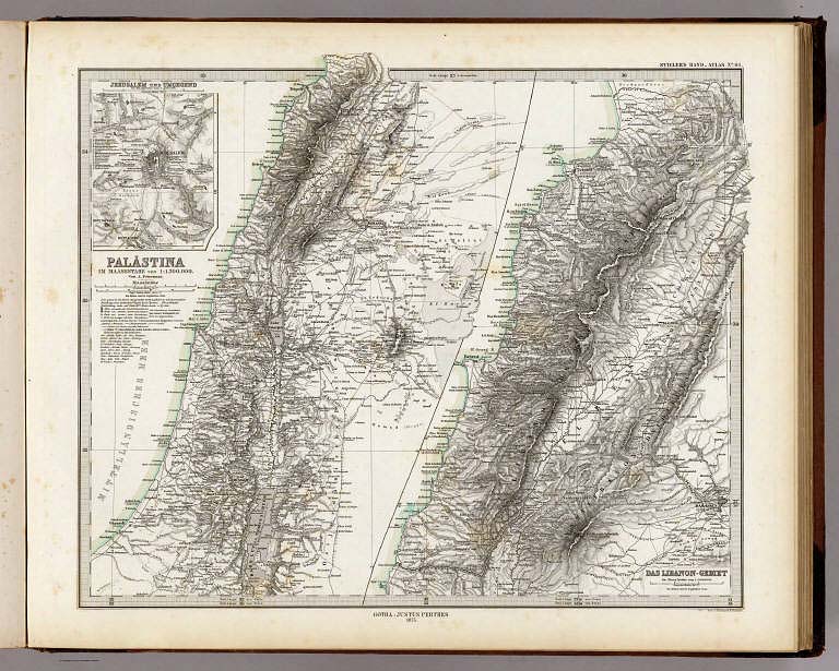 Full Title: Palastina Im Maassstabe Von 1:1.200.000. Von A. Petermann. Das Libanon-Gebiet Im Maassstabe Von 1:500.000. Gest. v. Eberhardt & Grunert. Gotha: Justus Perthes 1875.