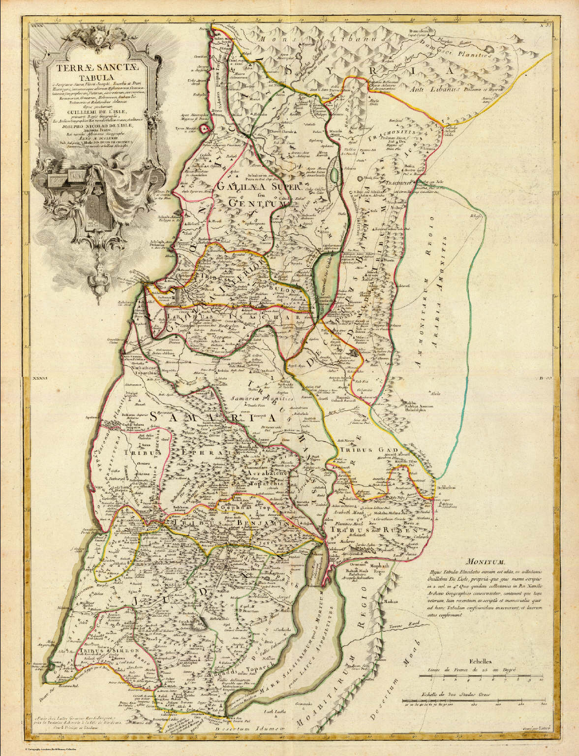 Full Title: (Composite of) Terrae Sanctae tabula e Scripturae Sacrae, Flavii Josephi, Eusebii et Divi Hieronymi ... Opus postimum Guillelmi de L'Isle, primarii Regis Geographi, ex Archivo Geographico Rei navalis Galliae erutum, et editum a Josepho Nicolao de l'Isle, auctoris fratre, Rei navalis Astronomo Geographo. Anno M.DCCLXXXII. Sub auspiciis illustr. D.D. Ducis de Choiseul, summi rei navalis et bellieae administri. Marillier, inv. Berthault, sculp. A Paris, chez Lattre Graveur, Rue St. Jacques, pres la Fontaine S. Severin a la Ville de Bordeaux. Sous la privilege de l'Academie. Grave par Lattre.
